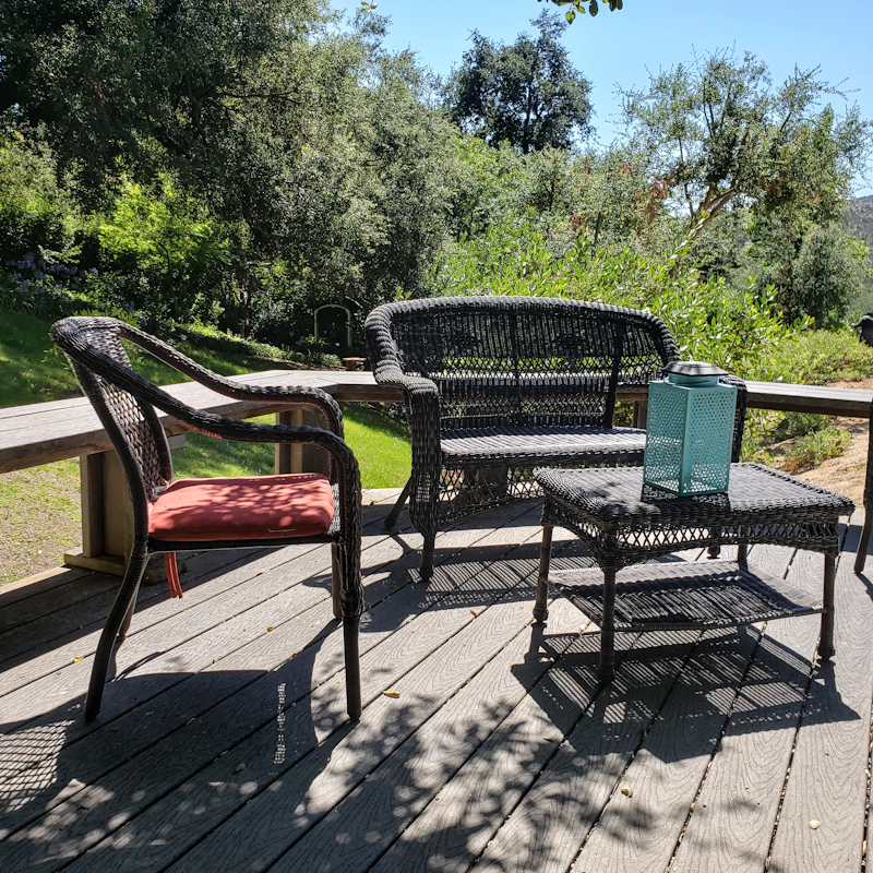 It is a pleasant spot and Rabbit hangs out there. *You can see the “no lawn-lawn” in the background in which Rabbit feeds on. But it also has a large old oak tree for shade which brings the temp down a bit and is in the same area as The Bench At Hummingbird Oak. The tin is a solar light that is just there because I forgot to take it down for the photo, but again, it’s Mrs. Shecky’s house and she was too lazy to go back and redo the photo after she noticed it in editing.