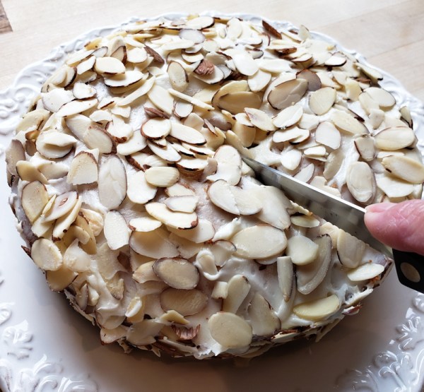 When the cake is cooled slice the cake in half (horizontally) and fill the cake with half the icing mixture then ice the top with the rest. This part does not have to be so neat because no one is going to really see it. It will be covered with almond slivers so go for it.