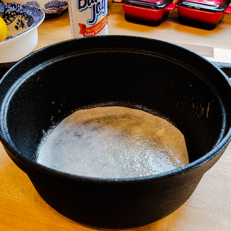 Preheat the oven to 320. Prep a 7″ cake pan or cast iron (as I did) with parchment and baking spray.
