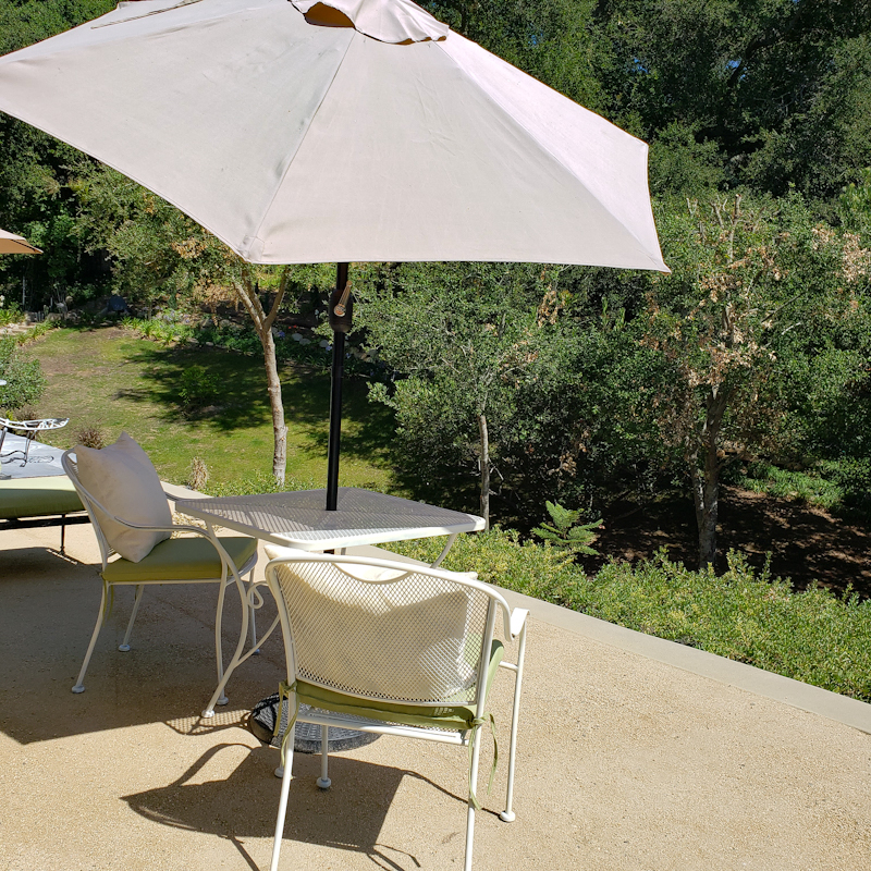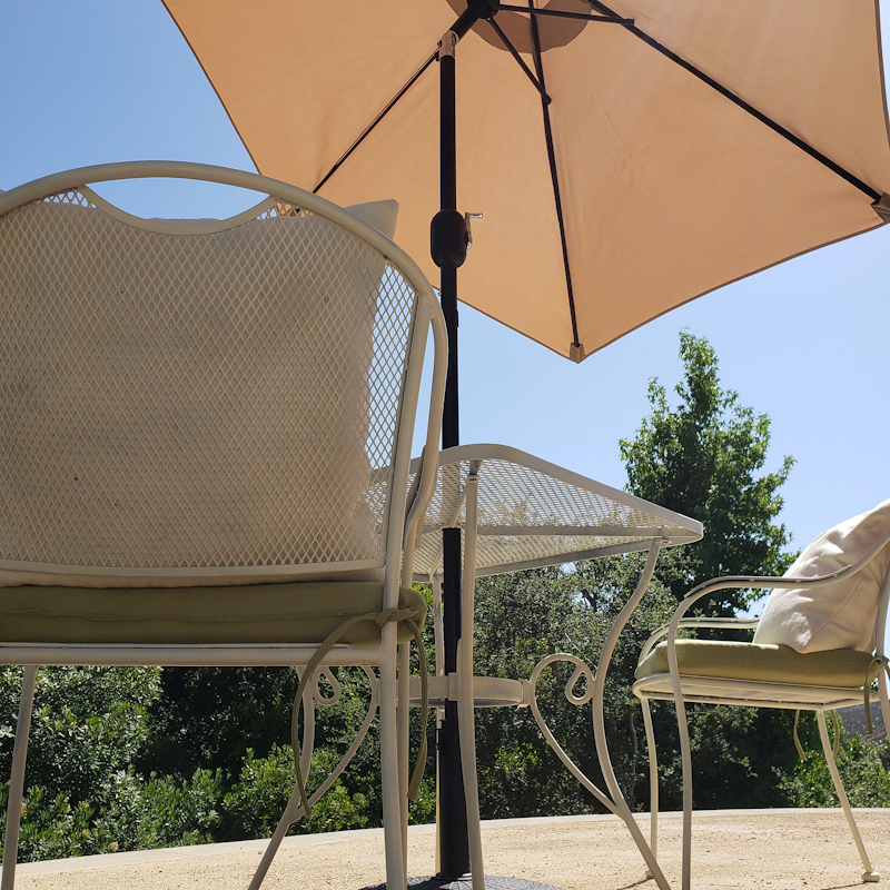 This set is pretty sturdy. Just a tightening up here and there but it holds the umbrella well. I normally don’t like to put umbrellas into the tables, but this is working out fine in the full sunshine on that side of the house. It gets hot.