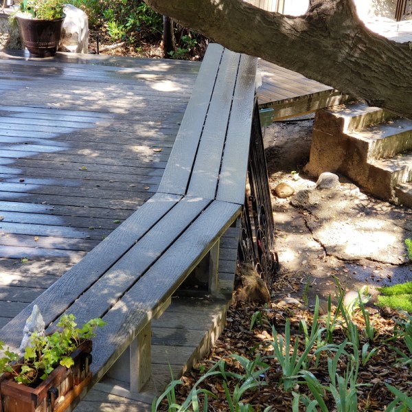 This is one of the original built in benches on this property. There are a couple of spots like this under some of the Oaks to just sit and take in the shade. The hummingbirds like this particular tree I guess because it is secured and they know I feed them. I have to stand on the bench to reach the feeder and I probably stand on it more than I sit on it, but it all works out. It needs work but until I muster up the attitude for a new project it works just fine as is.