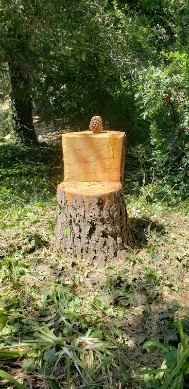 We had to cut a pine down *sigh*. It was just in the wrong place for the electricity and the winds were due to blow it down. It was also to large to stump grind so voila, a seat! Out of the tree we got a few more pieces to play with in the future. I am not so sure what to do with them yet and probably will keep them as is to place around the yard for various purposes. We will wait and see, but all in all I think the fairies and gnomes will like it as soon as I dress it up for them.