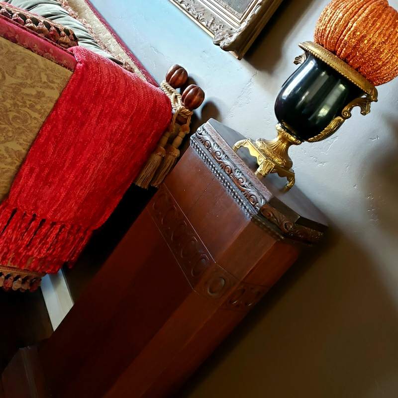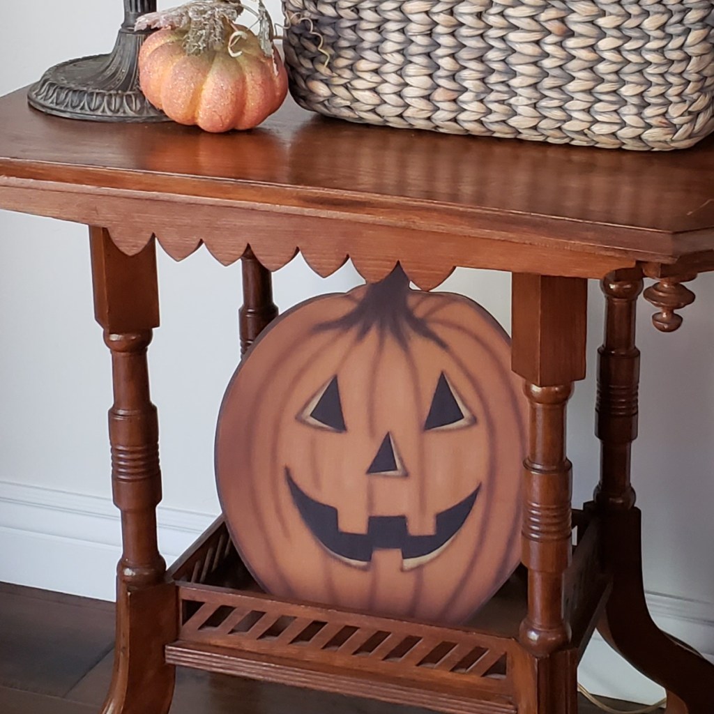 The foyer is the place for most of the glass pumpkins. Every year I collect a couple more from the vintage shops and local hobby stores. This year has been a bit harder because of the slow re-opening of places, but there is still more time for meandering to find more decor before Fall closes out this year.