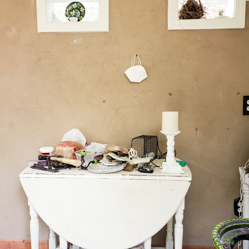A Monday makeover for Monday’s post. It is a little late in the day, but I am pooped. I went up to the shed today to finally clean it inside and out. After taking things off the walls to wash ash off, it was decided to completely remove everything for a makeover. It was just too much work and wiping ash off isn’t easy to do. Quite frankly, I am not up to washing the walls, doors and every little thing without starting over. So a complete revamp is in the works. Inside first.