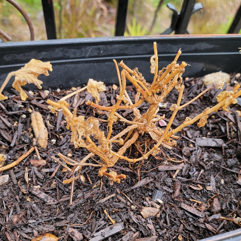 On the walk I noticed we had a death in the family. One of the Pink Floydmingos didn’t survive the move of the clan. After the relocation it looks like this roadie was left behind. The plants did not survive the heat either.