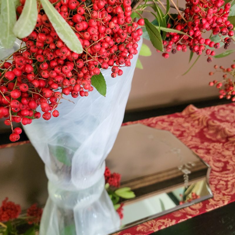 The red berries off the Hawthorne have taken their place in the house. After cutting them down they are put in a bucket of water and then they go into vases from there. Most get used unless there is a bad one that got caught in the bunch. The red is a favorite color this time of year. It is as simple as adding red to a space to make it festive for the season.