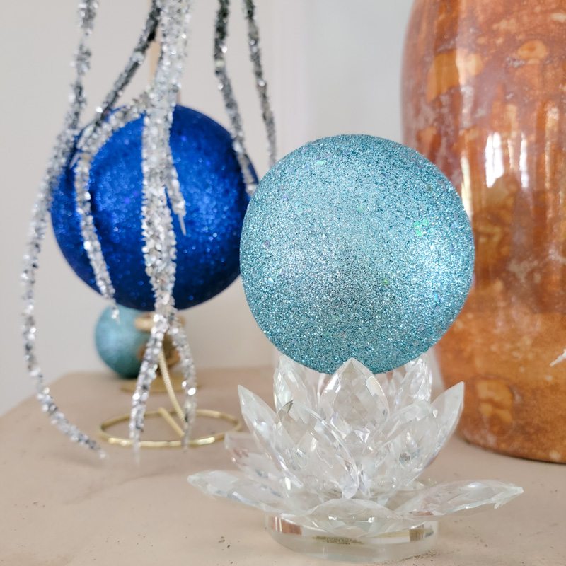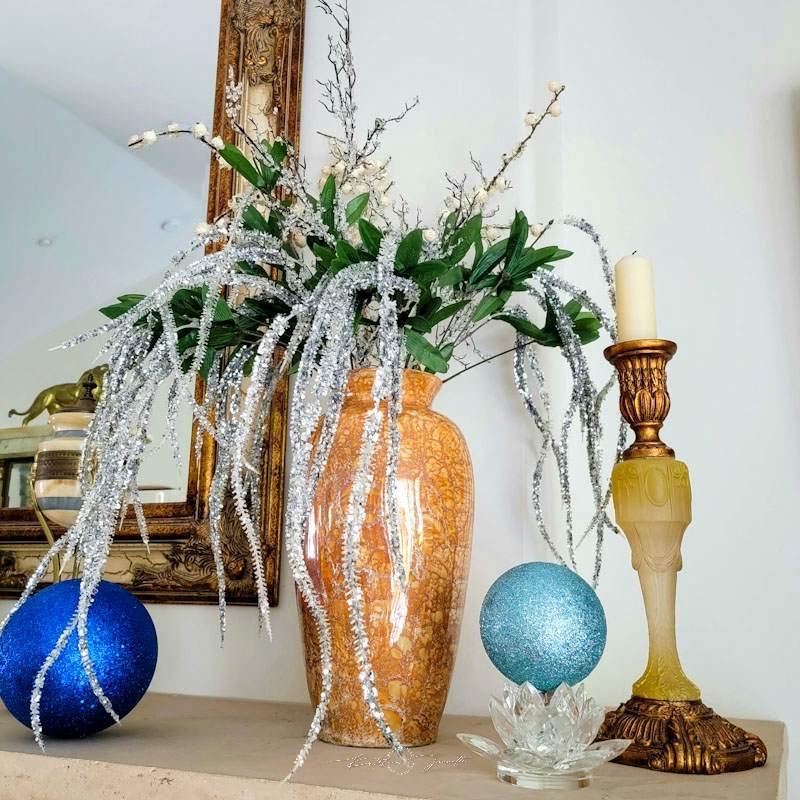 The mantle is doing double holiday duty set up for New Years also in gold and blue.