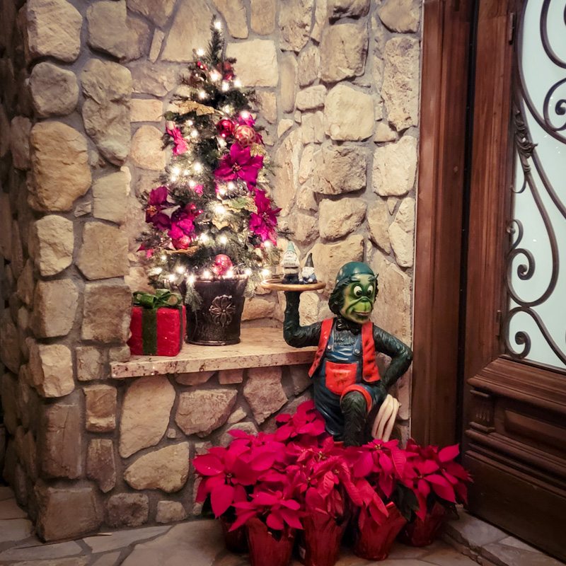 We do take a turn outside where the Grinch is. He is stomping on the poinsettias. Hopefully these will get planted and grow nicely if Mrs. Shecky has her way.