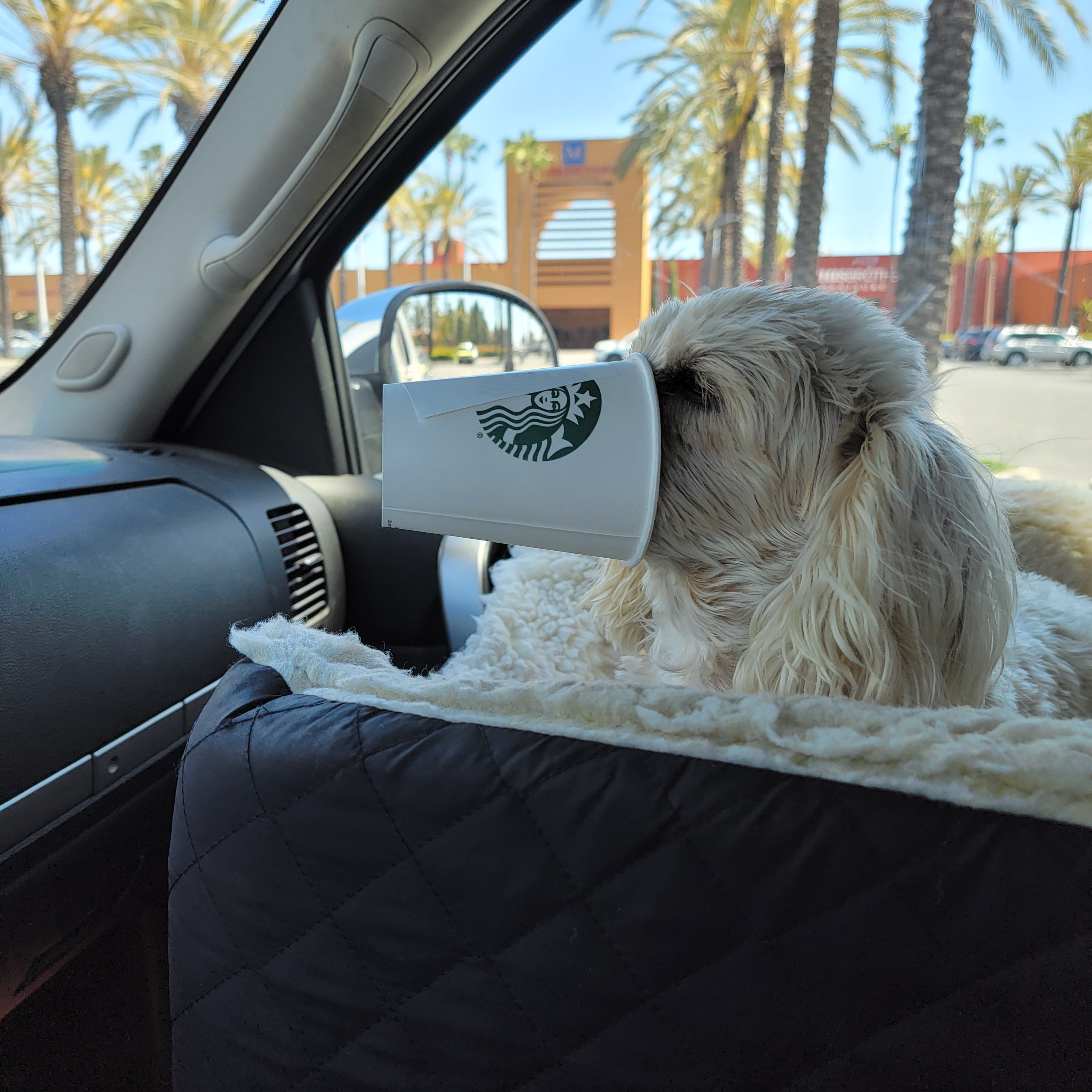 1. He gets what they call a puppacino which is non sweetened whipped cream over ice. It’s like a teaspoon and he loves it.