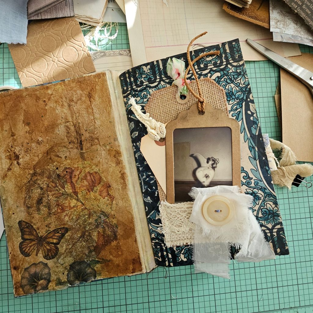 In the meantime, another book has begun. A “Junk Journal” mix media book. It has three signatures and room to add bits and bobs. So here is a little advance look-see.