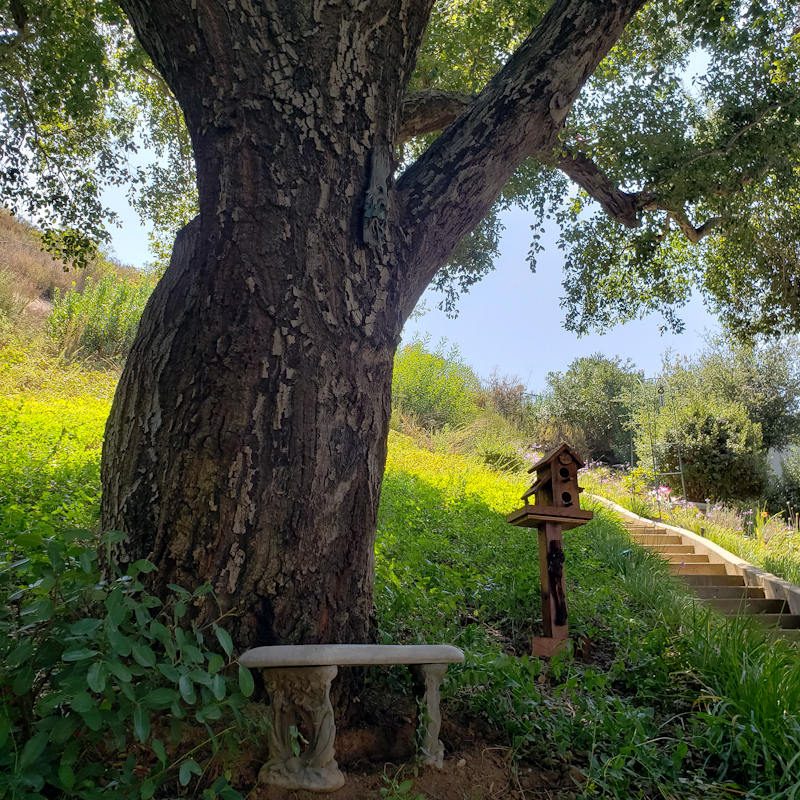 On the pathway down the hill is this little roundabout. We put the bench there for those long walks back down from the hill above. The birds like to hang out in the trees and scuffle on the ground for food. It is a good spot to sit and just listen. Dig the dirt and